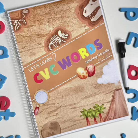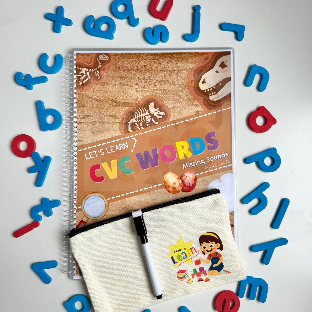 This book features 8 pages that are fully laminated, spiral-bound, and wipeable for repeated use. It is a Montessori-inspired activity book focused on finding the missing beginning, medial, and ending letter sounds. Students can independently identify the missing letter using movable letters or write it with a dry-erase marker.