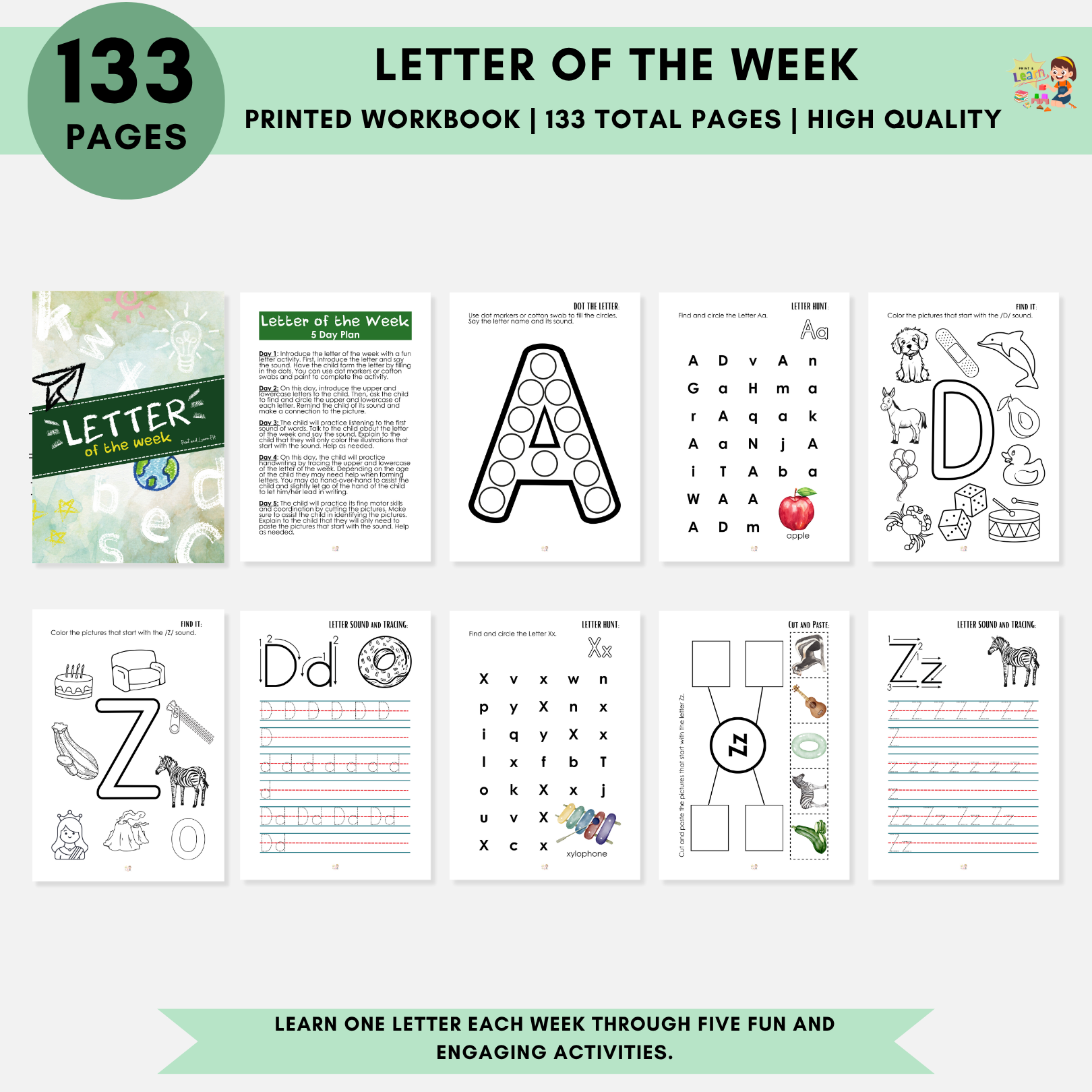 With this workbook, your child can enjoy a new activity each day of the week—designed to help them master the alphabet through play. Each of the 26 weeks focuses on a different letter and includes five engaging activities like letter tracing, cut and paste, letter dots, letter hunts, and find-it games.