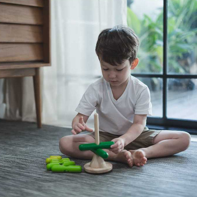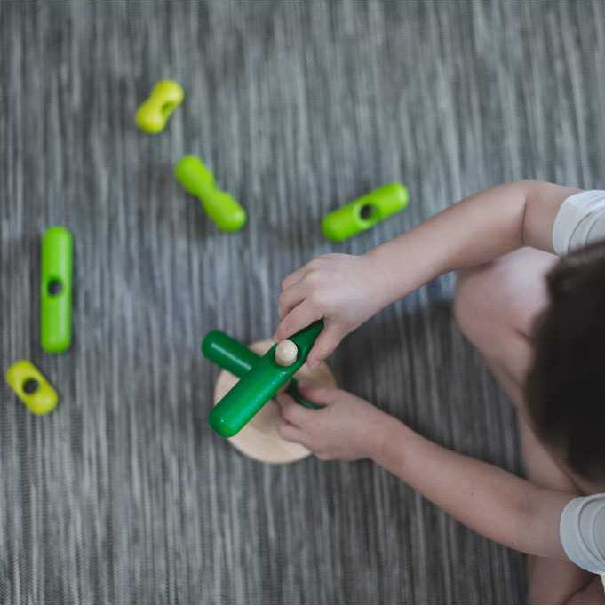 The Stacking Tree is a playful and educational wooden toy that The countless fun for children. It's designed to inspire creativity and enhance fine motor skills as kids stack the different pieces to form tree shapes. This set includes 1 trunk and 8 uniquely colored green branches, enhancing children's ising of color variation and size. The toy promotes the development of gross motor skills with its rounded base, which requires balancing while threading the branches on. Also, the process encourages problem-solving and concentration. As a sustainably produced toy from Thailand, the Stacking Tree not only delights but also educates, making it a wonderful addition to any child's playroom.